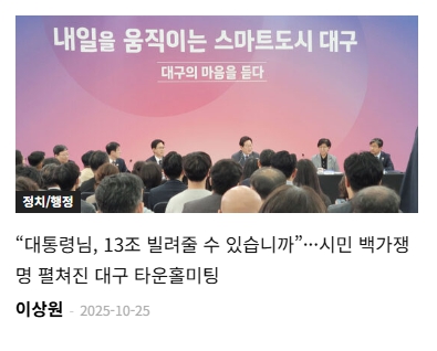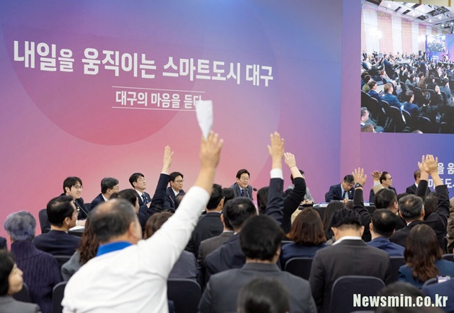 | | | ▲24일 오후 대구 엑스코에서 열린 이재명 대통령 타운홀미팅은 대구시민들이 대통령에게 직접 정책을 제안하고 의견을 전할 기회에 얼마나 목말라했는지를 그대로 보여줬다.  |