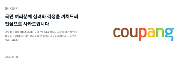 ▲ 쿠팡 측이 지난달 30일 홈페이지를 통해 사과문을 게시했다. (홈페이지 갈무리) |