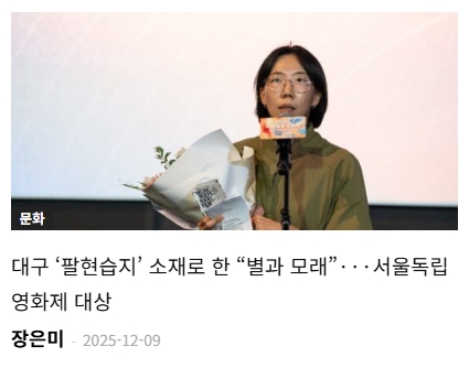 🎤 감정원 감독의 <별과 모래>가 서울독립영화제에서 대상을 수상한 것인데요. 감 감독은 대구를 주무대로 활발한 활동을 펼쳐오고 있는 독립영화 감독입니다. 지난 2021년에도 대구 염색공단을 배경으로 다룬 영화 <희수>로 전북독립영화제에서 대상을 수상하기도 했어요. [관련기사= 죽어서도 노동을 떠나지 못하던 ‘희수’(‘21.11.06)] 🎬