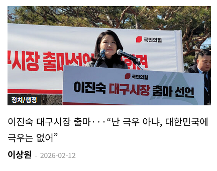이상원 기자🎤 가장 큰 변곡점은 2월 26일이 될 거 같습니다. 국회 행정안전위원회를 통과한 통합특별법이 정말 그날 본회의를 통과하면, 선거판은 요동칠 수 밖에 없습니다. 대구시장이 아니라 대구경북특별시장을 뽑아야 하니까요. 국민의힘은 대구시장 출마 후보자와 경북도지사 출마 후보자 전체를 두고 최종 후보자를 정해야 하는 숙제가 생깁니다. 못해도 15명 정도의 후보자가 나설 예정이라 후보 선출 경선 자체가 대선급이 될 전망이에요.