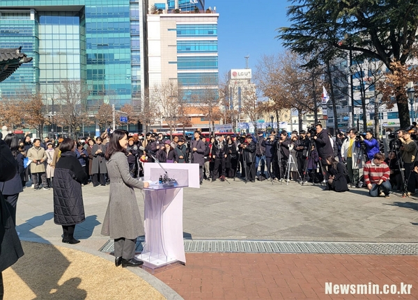▲ 12일 오후 대구 중구 국채보상운동공원에서 열린 이진숙 전 위원장 대구시장 출마 기자회견은 앞선 현역 국회의원들의 출마 선언과 비교해 한산했다. |