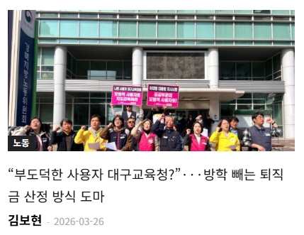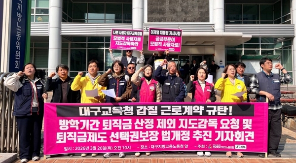 전국 17개 시·도 교육청 중 유일합니다. 대구교육청은 “방학 때 일을 하지 않는데 퇴직금 산정에 포함하면 형평성에 어긋난다”는 입장이에요. 반면 노조는 “다른 시·도 교육청은 방학 중 비근무 문제를 완화하기 위해 상시직 전환, 근무일수 확대, 방학 중 생계지원금 지급 등의 보완책을 도입하고 있지만, 대구교육청은 퇴직금 산정 방식까지 불리하게 적용하고 있다”고 반발하고 있죠.