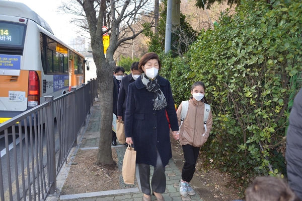 ▲지난 2022년 당시 노옥희 울산교육감이 아프간 특별기여자 자녀의 손을 잡고 첫 등교를 하는 모습. (사진=노옥희 교육감 페이스북 ) |